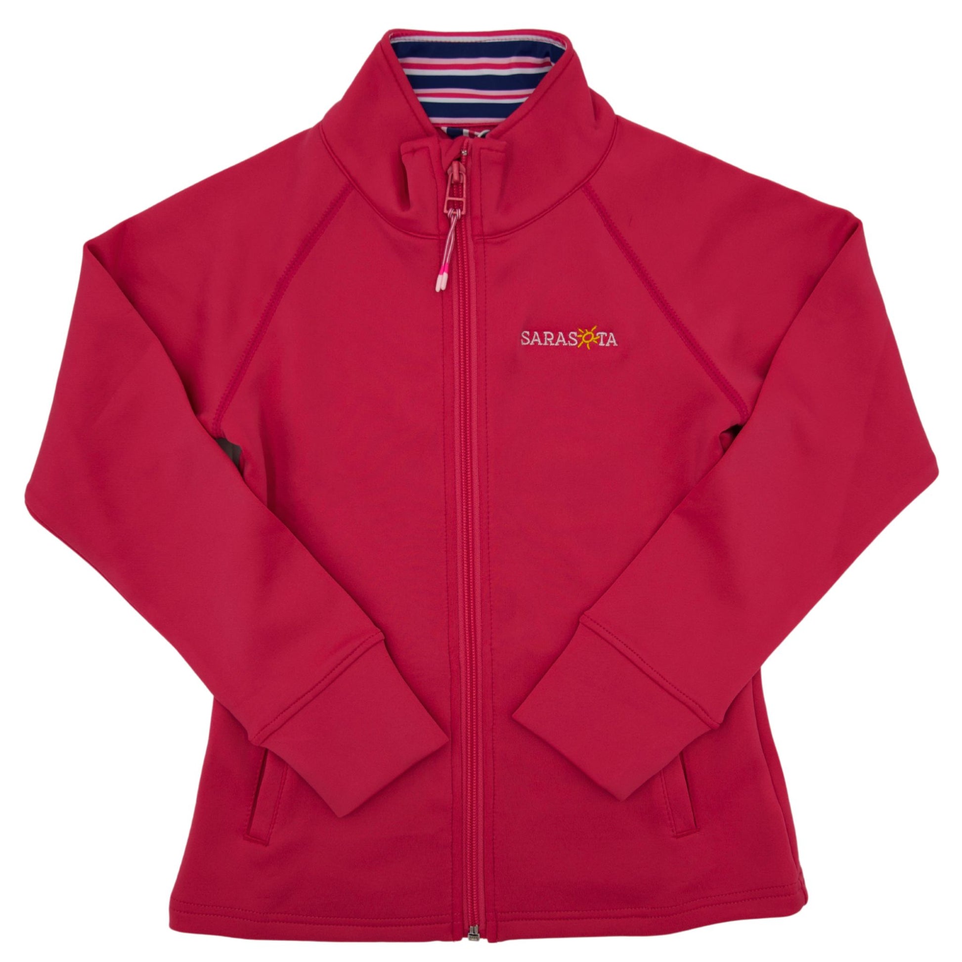 The Sarasota Girls Full Zip is made with Spacer performance scuba, this layering piece is designed for high-performance activities. The full zip with zipper guard ensures a snug fit, while the interior collar's striped fabric and printed design add a touch of style. Keep your essentials close with the convenient side pockets.