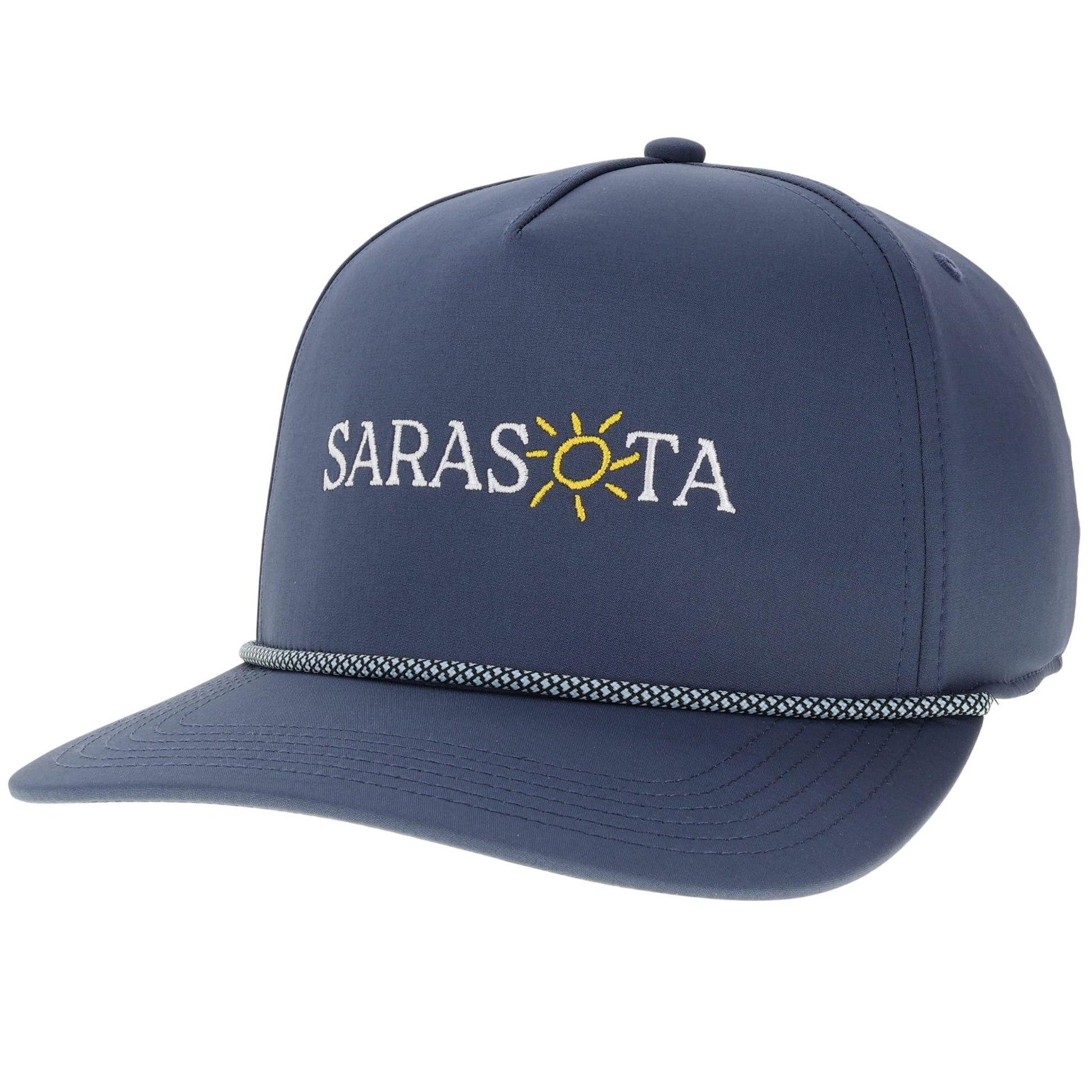 The Sarasota Caddy is a retro-inspired, high crown cap, a slight curve visor, and snapback closure. The lightweight fabric is made from a no-sheen, moisture-wicking poly spandex with recycled fibers.