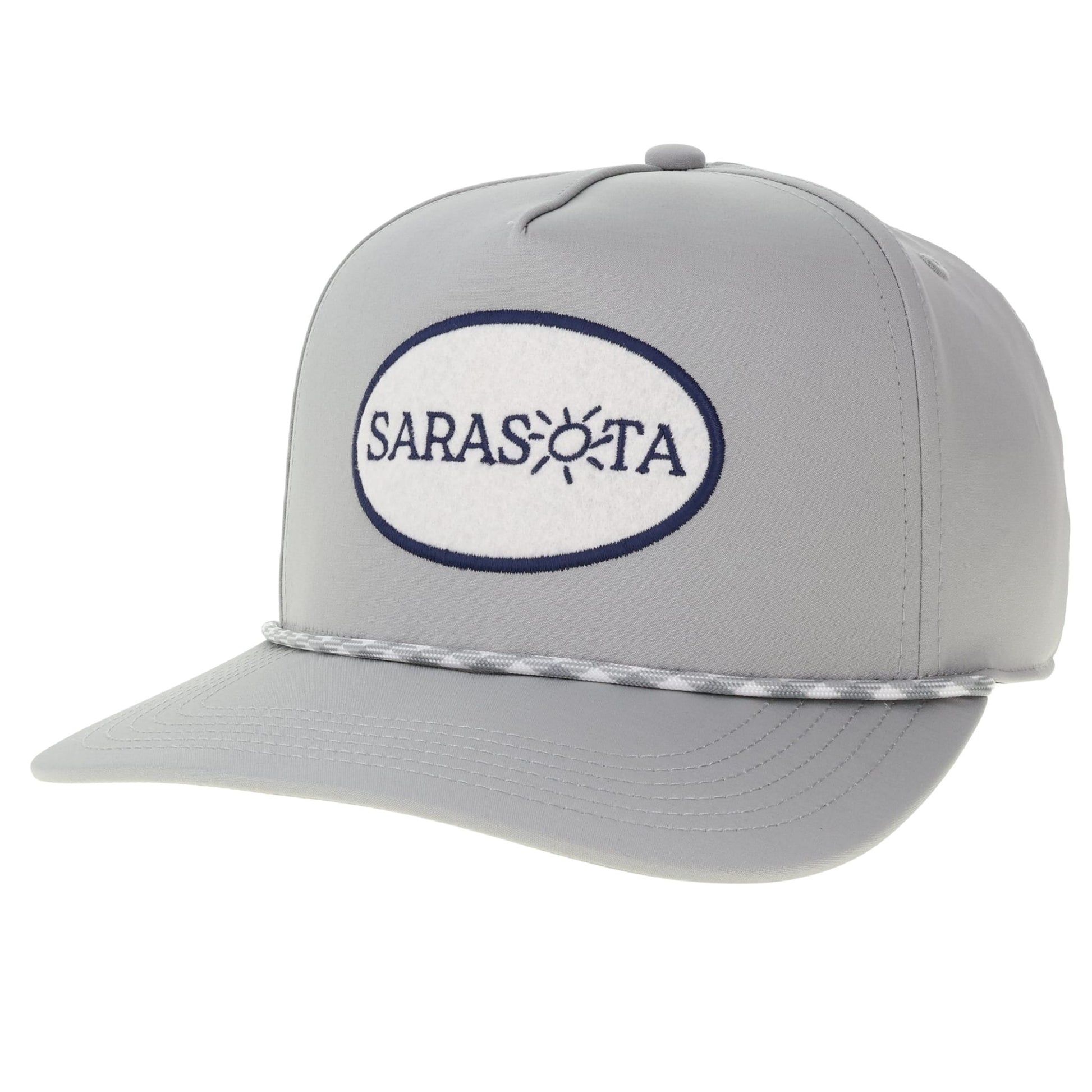 The Sarasota Caddy is a retro-inspired, high crown cap, a slight curve visor, and snapback closure. The lightweight fabric is made from a no-sheen, moisture-wicking poly spandex with recycled fibers.